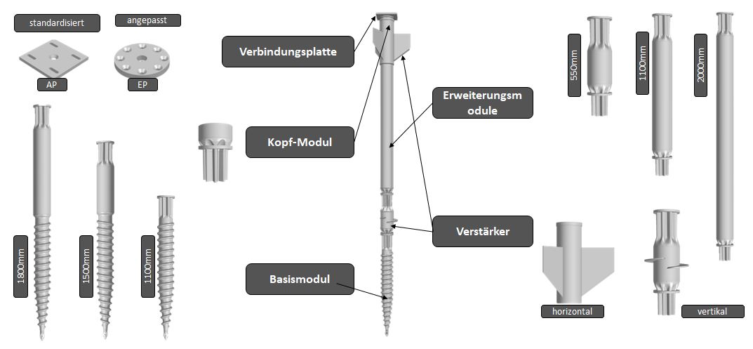 Das modulare System ermöglicht das Verbinden einzelner Module miteinander und schafft so einen einheitlichen Schraubfundamentpfahl, in der Praxis sogar bis zu einer Länge von 12 m. Die Basis des Pfahls ist immer das Basismodul, dessen Gewinde in der Flowforming-Technologie hergestellt wird. Das Basismodul ist in 3 Längen erhältlich. Verlängerungsmodule sind ebenfalls in 3 verschiedenen Längen verfügbar. Der Schraubpfahl wird mit einem Kopf oder einer Verbindungsplatte abgeschlossen, an denen die zu stützende Zielkonstruktion befestigt wird. Falls eine Erhöhung der geotechnischen Eigenschaften erforderlich ist, setzen wir vertikale und horizontale Booster ein.