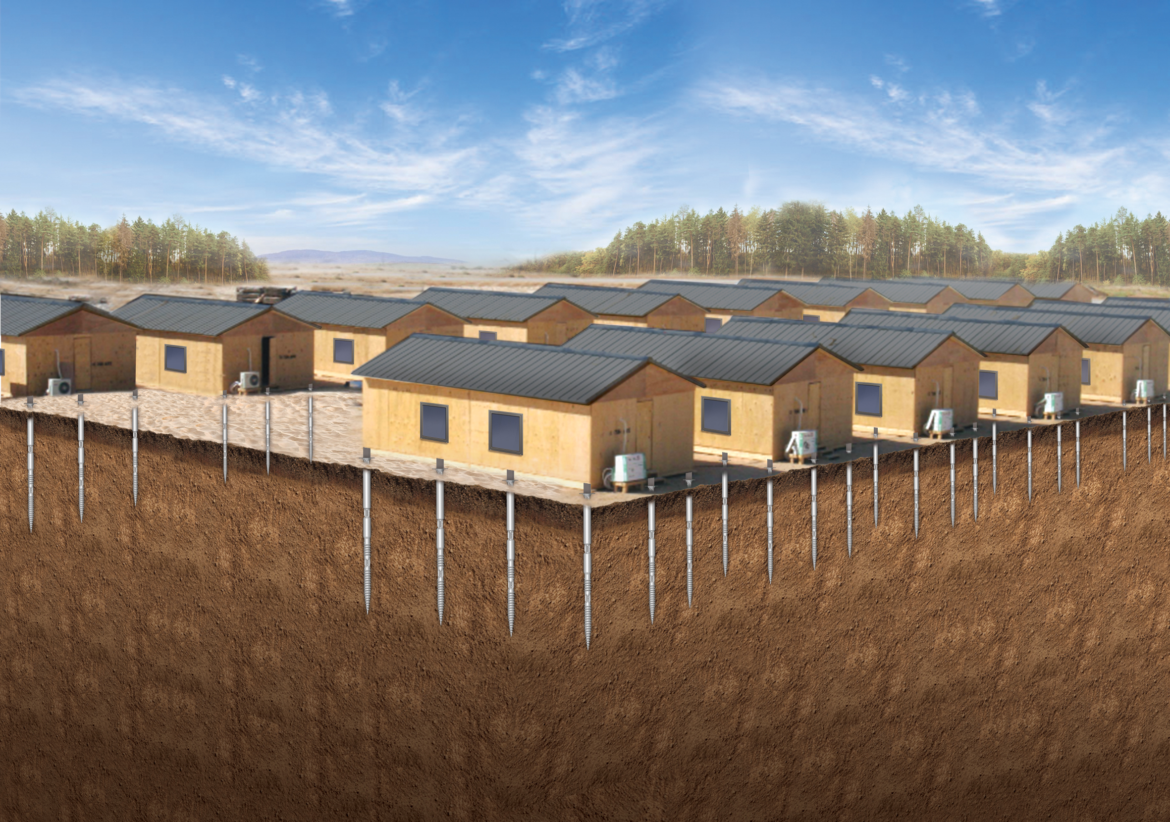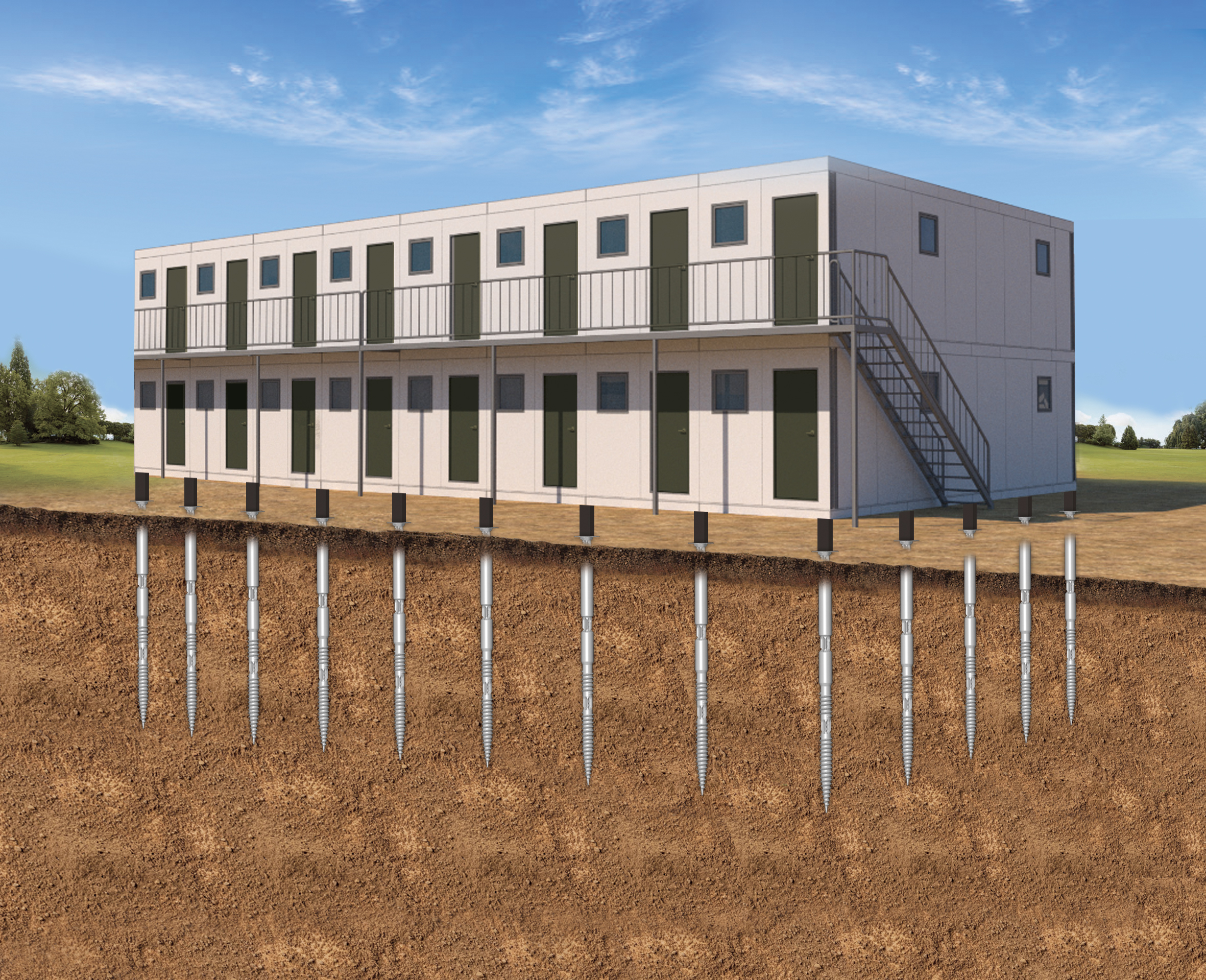 Screw pile foundations – also known as ground screws – are a modern and flexible solution. The Winkelmann Foundation Screw system eliminates the need for concrete and allows for installation in any weather, using light machinery to screw the steel piles into the ground.