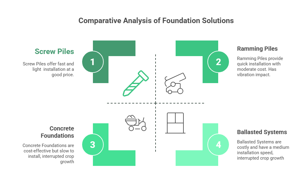Let’s walk through the comparison of different foundation systems used in AgriPV projects, focusing on six critical criteria