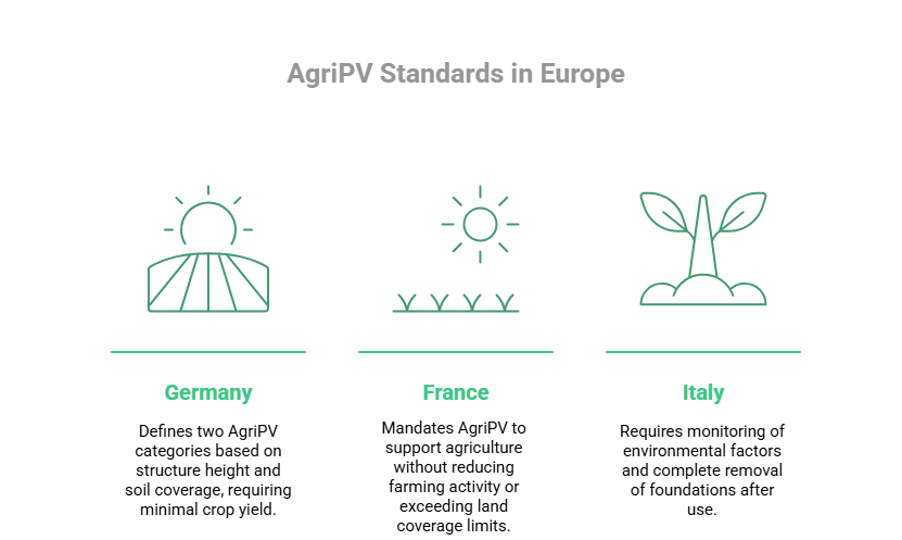 Across the EU, AgriPV systems are being regulated to ensure real synergy between solar energy production and agricultural activity. Let’s break down the main requirements from three key markets:
