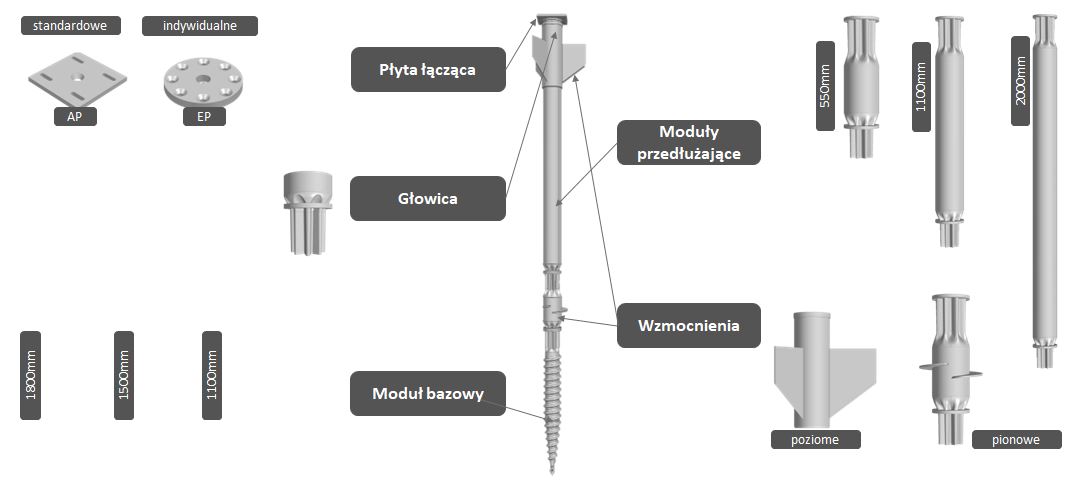 The modular system allows for connecting individual modules together, creating a uniform screw foundation pile, in practice even up to 12m in length. The base of the pile is always the base module, whose thread is produced using flowforming technology. The base module is available in 3 lengths. Extension modules are also available in 3 different lengths. The screw pile is topped with a head or a connecting plate, to which the target supported structure is mounted. In case of the need to increase geotechnical properties, we apply vertical and horizontal boosters accordingly.