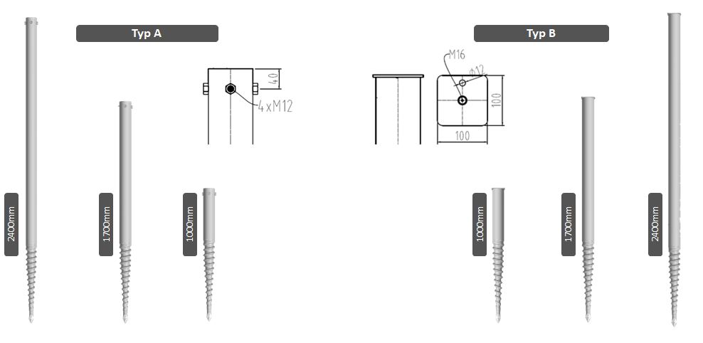 The 88.9 system consists of foundation screws with an external diameter of 88.9mm and wall thicknesses of 2.0 or 3.6mm. The thread is formed using our traditional flowforming technology. These screws are available in fixed lengths: 1.0m, 1.7m, and 2.4m. For connection with the supported structure, two types of “heads” are used: Type A – recessed with external thread, and Type B – frontal.