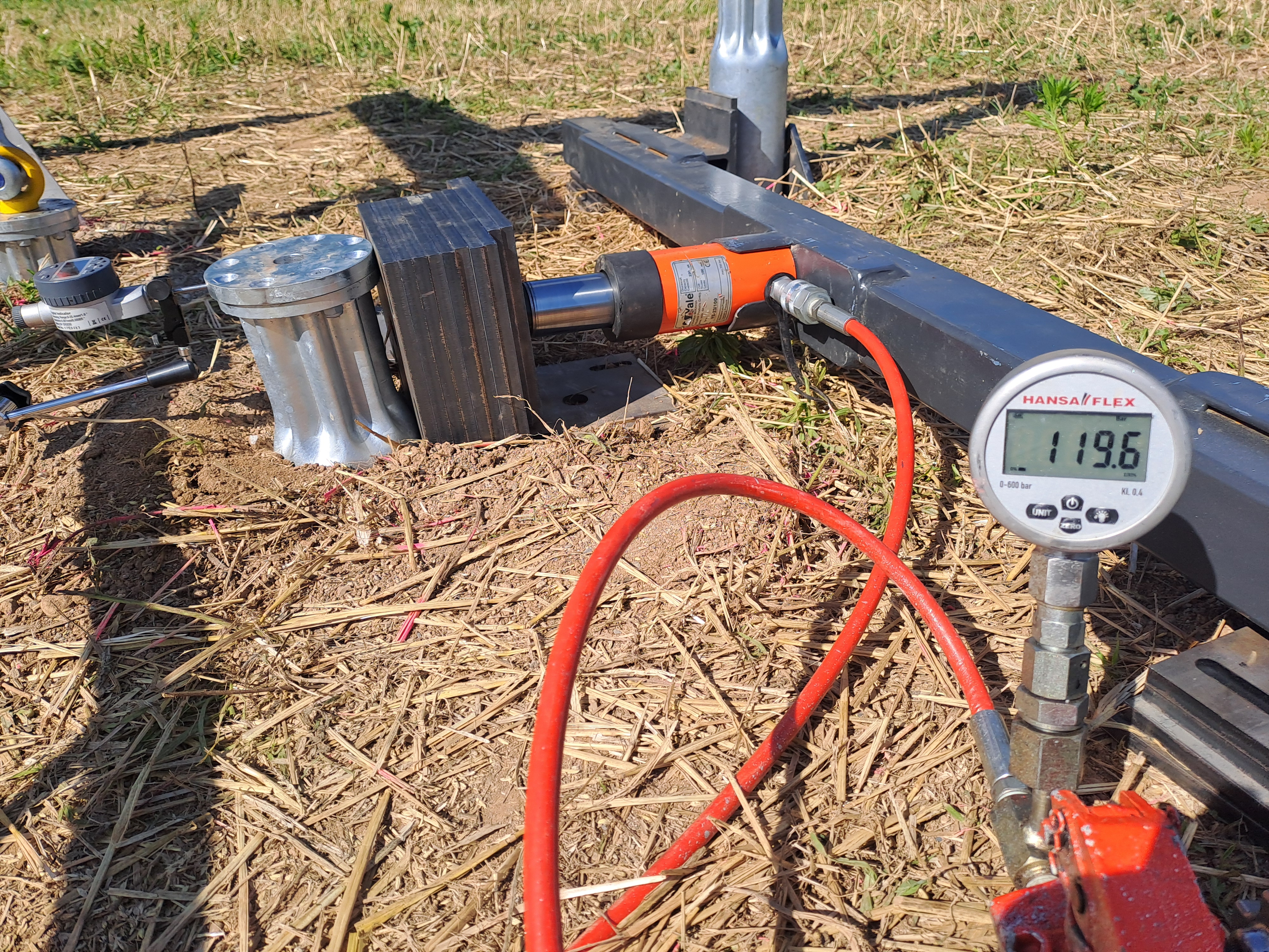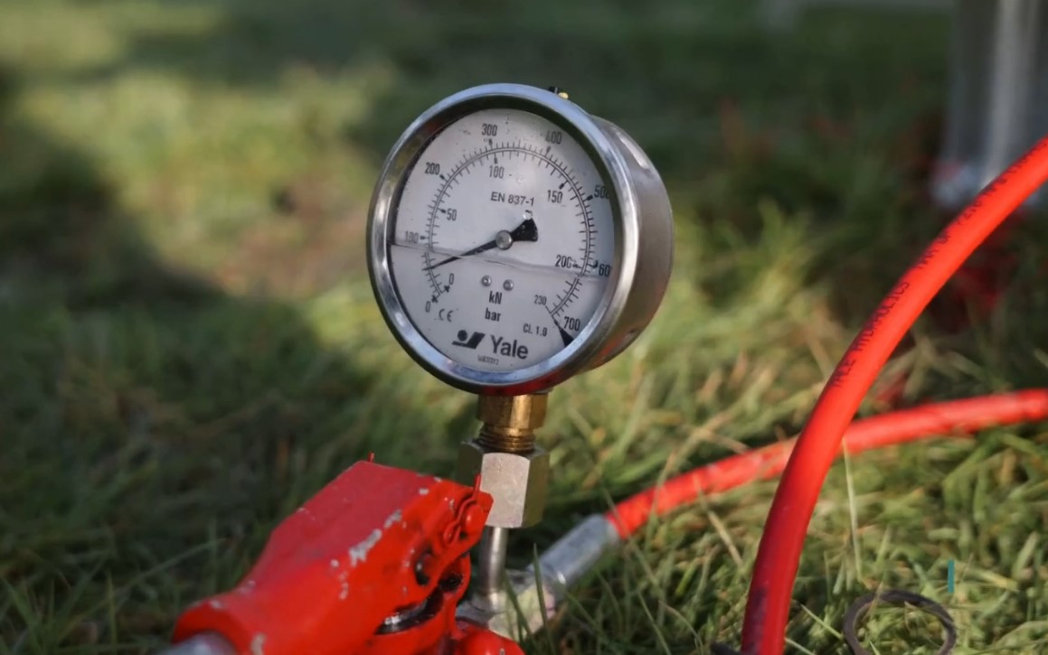 During the load test, the pressure in the hydraulic jack is gradually increased or decreased in defined time intervals and cycles to reach the levels specified in the test sheet. At each stage, the current displacement is read and recorded using the dial gauge. Pressure readings are typically in bar, which, with knowledge of the cylinder area, can be directly converted into the force applied to the pile in kN. Displacements are measured in mm with appropriate precision.