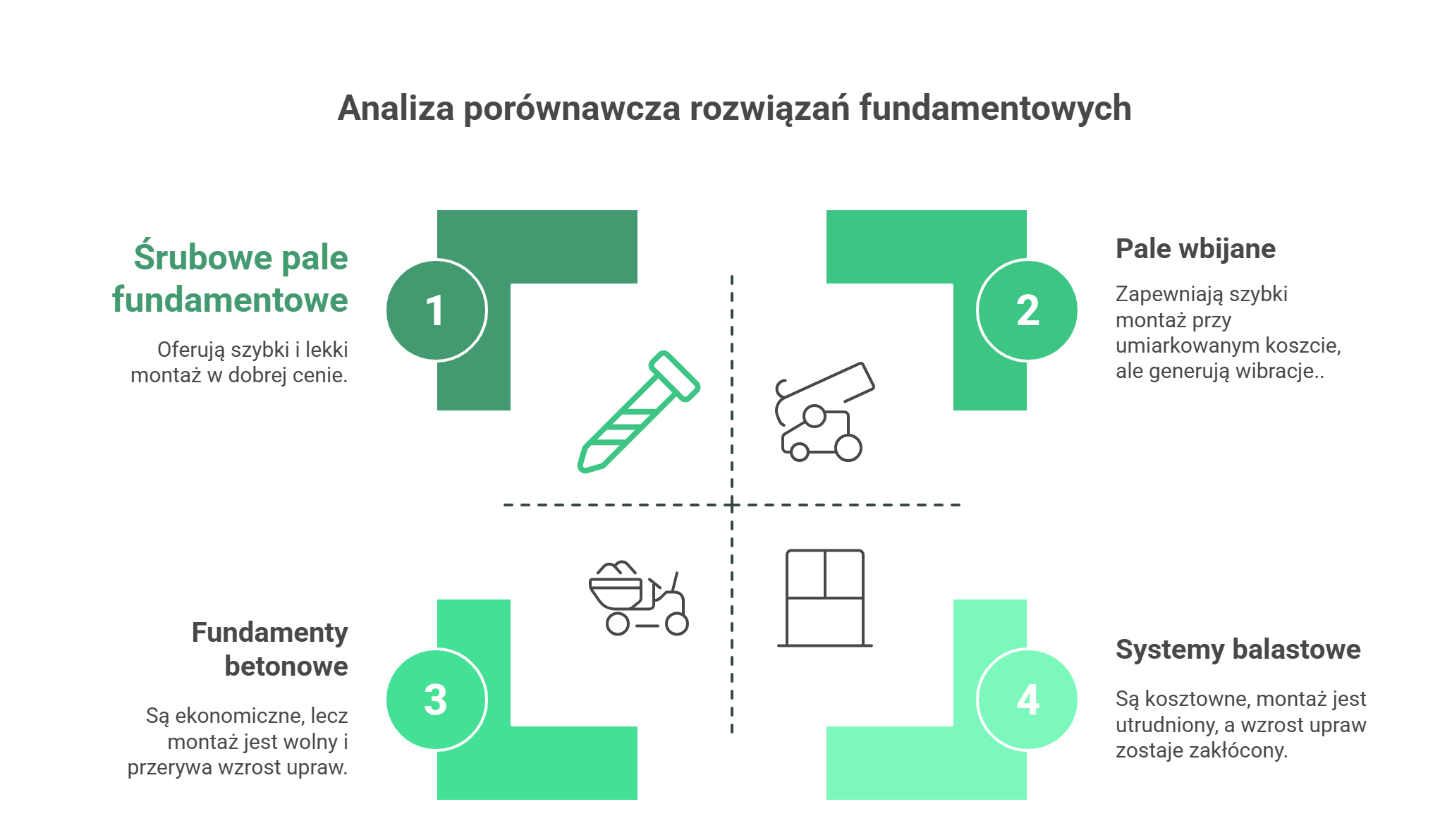 Ochrona gleby: Pale śrubowe są najlepsze w klasie – są instalowane bez wykopów, powodują minimalne zakłócenia wierzchniej warstwy gleby i zachowują żyzność ziemi. Pale wbijane są również skuteczne, ale wymagają ciężkich maszyn, które mogą generować wibracje i zagęszczenie mogące wpłynąć na glebę. Fundamenty betonowe wypadają najgorzej – często zagęszczają lub uszkadzają strukturę gleby i mogą zakłócać infiltrację wody i systemy korzeniowe.