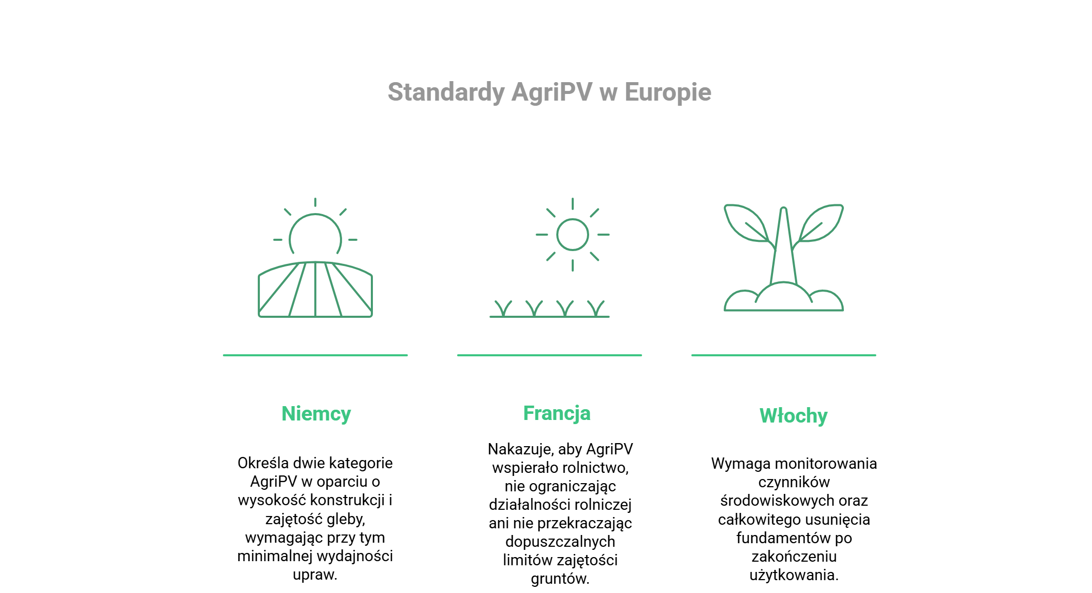 Włochy: Dodają przepisy dotyczące przepuszczalności światła, żyzności gleby i równowagi mikroklimatu. Fundamenty muszą być w pełni usuwalne i pozwalać na przywrócenie ziemi po zakończeniu eksploatacji.